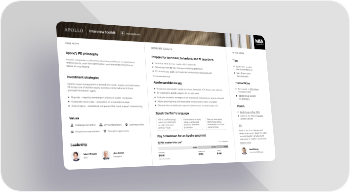 Firm Facts Apollo’s PE philosophy Acquire companies at attractive valuations and focus on operational improvements, cash flow optimization, and downside protection to deliver strong returns. Investment strategies Apollo’s asset management is divided into credit, equity, and real assets. PE is the core of Apollo’s equity business, centered around three principal transaction types. Buyouts – majority ownership in private or public companies Corporate carve-outs – acquisition of a standalone asset Deleveraging – established companies that need support restructuring Values Challenge convention Drive collaboration Lead responsibly Outperform expectations Champion opportunity Leadership Marc Rowan CEO Jim Zelter President Interview Insights Prepare for technical, behavioral, and fit questions Technical: How do you model a CLO waterfall? Behavioral: How do you manage conflicting priorities? Fit: How do you apply an investment philosophy in deal analysis? Further examples here Apollo candidates say Know your past deals: capital structure, financials, FCF drivers, and returns Be prepared to build a paper LBO on each deal Evaluate the deal’s strength as an investment and present a strong rationale Adjust assumptions and recalculate revised returns when prompted Discuss returns attribution specifics (what drove the deal’s returns?) Speak the firm’s language FCF is the firm’s key metric (not EBITDA) so make that your primary focus Concentrate on being value-oriented and prioritize downside protection Discuss leveraging the firm’s existing investments in future opportunities In the Media Interview toolkit www.apollo.com Talk Apollo chief predicts Wall Street shake-up Marc Rowan given five more years Transactions Firm record of $222 billion invested in 2024 Barnes Group acquired for $3.6 billion Watch Apollo Investor Day 2024 Zelter on the future of public, private markets Look at the firm’s website and review their recent deals. You want to build the story of why you’re interested in that firm specifically. Read the article Neal Monga Principal at NMS Capital Pay breakdown for an Apollo associate Base pay Bonus pay Stock 54.8% 27.2% 17.5% $279K median total pay* $153K $76K $49K Source: Glassdoor *As of Apr 10, 2025