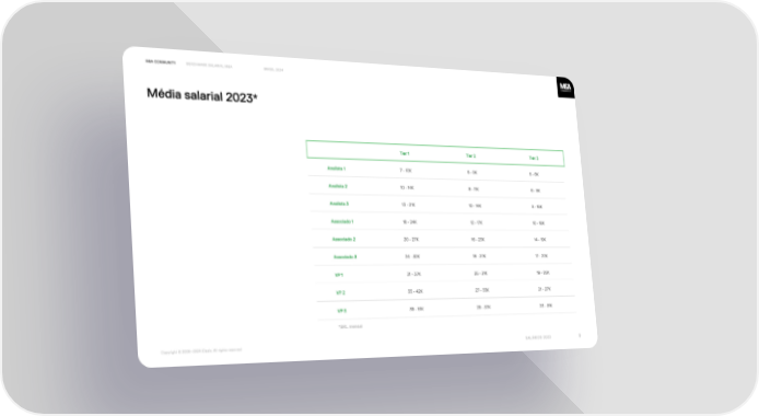M&A Community Benchmark Salarial M&A Brasil 2024 Média salarial 2023* Tier 1 Tier 2 Tier 3 Analista 1 7 - 10k 6 - 9k 5 - 8k Analista 2 10 - 14k 8 - 11k 6 - 9k Analista 3 13 - 21k 10 - 14k 9 - 16k Associado 1 16 - 24k 12 - 17k 10 - 18k Associado 2 20 - 27k 16 - 23k 14 - 19k Associado 3 24 - 32k 18 - 27k 17 - 22k VP 1 31 - 37k 25 - 31k 19 - 25k VP 2 33 - 42k 27 - 33k 21 - 27k VP 3 39 - 51k 29 - 37k 23 - 31k *BRL mensal Copyright © 2008—2024 iDeals. All rights reserved Salários 2023 9
