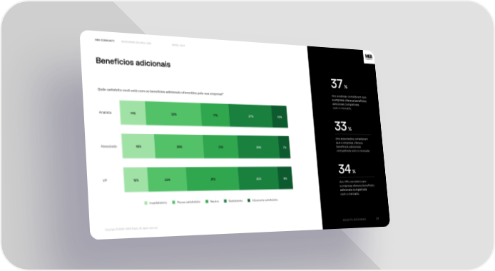 M&A Community Benchmark Salarial M&A Brasil 2024 Benefícios adicionais 37% dos analistas consideram que Quão satisfeito você está com os benefícios adicionais oferecidos pela sua empresa? a empresa oferece benefícios adicionais compatíveis†⠀ com o mercado. 14% 32% 17% 27% 10% Analista 33% dos associados consideram que a empresa oferece benefícios adicionais 18% 28% 21% 26% 7% Associado compatíveis com o mercado. 34% 13% 22% 31% 25% 9% VP dos VPs considera que†⠀ a empresa oferece benefícios adicionais compatíveis†⠀ com o mercado. Insatisfatório Pouco satisfatório Neutro Satisfatório Altamente satisfatório Insights Adicionais 23 Copyright © 2008—2024 iDeals. All rights reserved