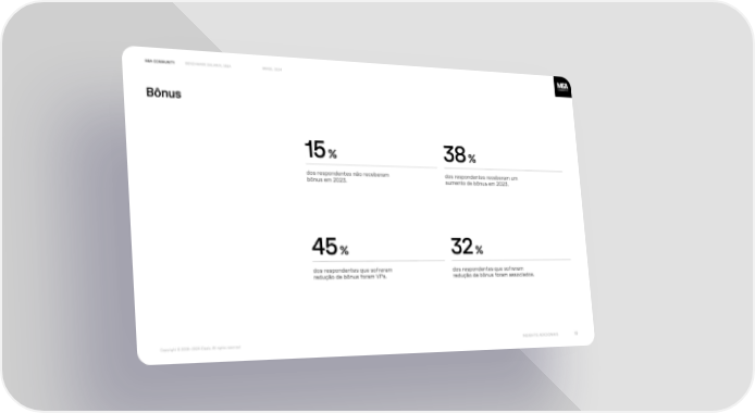 M&A Community Benchmark Salarial M&A Brasil 2024 Bônus 15% 38% dos respondentes não receberam dos respondentes receberam um bônus em 2023. aumento de bônus em 2023. 45% 32% dos respondentes que sofreram dos respondentes que sofreram redução de bônus foram VPs. redução de bônus foram associados. Copyright © 2008—2024 iDeals. All rights reserved Insights adicionais 19