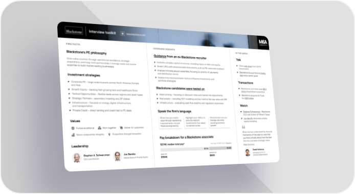 Firm Facts Blackstone’s PE philosophy Drive value creation through operational excellence, strategic acquisitions, and long-term partnerships. Leverage scale and sector expertise to build market-leading businesses. Values Pursue excellence Work together Deliver for customers Never compromise integrity Outperform through innovation Leadership Stephen A. Schwarzman CEO and Director Joe Baratta Global Head of Private Equity Interview Insights Guidance from an ex-Blackstone recruiter Evaluate complex capital structures, including layers of debt and equity Model LBOs with advanced debt instruments, such as PIK notes and revolvers Analyze intricate payout waterfalls, focusing on priority of payments and distribution terms Assess how macroeconomic factors influence investments and portfolio strategies Blackstone candidates were tested on Asset pricing – focusing on discount rates and market risk adjustments Real estate – including DCF modeling and key metrics like cap rates and IRR Infrastructure – evaluating cash flow stability and regulatory awareness Speak the firm’s language Show how you create value through operational improvements, not just financial engineering Highlight your ability to execute resilient investments that adapt to market cycles Demonstrate how you manage risk while pursuing business growth In the Media Interview toolkit www.blackstone.com Talk China pulls back from US PE investments Blackstone buyout fund is closing late, below earlier goals Transactions Blackstone and Vista close $8.4 billion Smartsheet acquisition Blackstone acquires AirTrunk for A$24 billion Watch Stephen Schwarzman – Blackstone CEO and Author of "What It Takes" Joe Baratta discusses private equity investing Show that you understand the financial mechanics of the deal but also that you think critically about how the deal fits into a broader strategic vision. Read the article David Acharya Managing Partner of Acharya Capital Partners Pay breakdown for a Blackstone associate Base pay Bonus pay 67.2% 32.8% $274K median total pay* $184K $90K *As of Apr 10, 2025. Source: Glassdoor Investment strategies Corporate PE – large-scale buyouts across North America, Europe, and Asia Growth Equity – backing fast-growing tech and healthcare firms Tactical Opportunities – flexible deals across regions and asset types Strategic Partners – secondary investing and GP stakes Infrastructure – focused on energy, digital infrastructure, and transportation Private Credit – direct lending and credit tied to PE deals