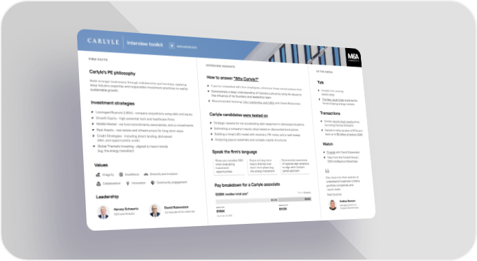 Firm Facts Carlyle’s PE philosophy Build stronger businesses through collaborative partnerships, applying deep industry expertise and responsible investment practices to realize sustainable growth. Values Integrity Excellence Diversity and inclusion Collaboration Innovation Community engagement Leadership Harvey Schwartz CEO and Director David Rubenstein Co-founder & Co-chairman Interview Insights How to answer “Why Carlyle?” If you’ve networked with firm employees, reference those conversations here Demonstrate a deep understanding of Carlyle’s culture by tying its values to the influence of its founders and leadership team Recommended listening: Life, Leadership, and LBOs with David Rubenstein Carlyle candidates were tested on Strategic reasons for not accelerating debt repayment in distressed situations Estimating a company’s equity value based on discounted bond prices Building a timed LBO model with revolvers, PIK notes, and a cash sweep Analyzing payout waterfalls and complex capital structures Speak the firm’s language Show you consider ESG when evaluating investment opportunities Focus on long-term macro themes over short-term plays (e.g. the energy transition) Demonstrate awareness of regional deal variations to align with Carlyle’s global approach In the Media Interview toolkit www.carlyle.com Talk Carlyle’s fee-earning assets drop The New Joule Order explores the forces shaping energy markets Transactions Carlyle reports best results since recruiting Harvey Schwartz Carlyle to ramp up pace of IPOs as it eyes up to $5 billion of exits in 2025 Watch Fireside with David Rubenstein View from the Carlyle Group | CEO Intelligence Advantage Dive deep into their website to understand investment criteria, portfolio companies, and recent deals. Read the article Andrea Benson Managing Director at Prospect Rock Partners Pay breakdown for a Carlyle associate Base pay Bonus pay 64.2% 35.8% $288K median total pay* $185K $103K Source: Glassdoor *As of Apr 10, 2025 Investment strategies Leveraged Buyouts (LBOs) - company acquisitions using debt and equity Growth Equity - high-potential tech and healthcare firms Middle Market - via fund commitments, secondaries, and co-investments Real Assets - real estate and infrastructure for long-term value Credit Strategies - including direct lending, distressed debt, and opportunistic credit Global Thematic Investing - aligned to macro trends (e.g. the energy transition)