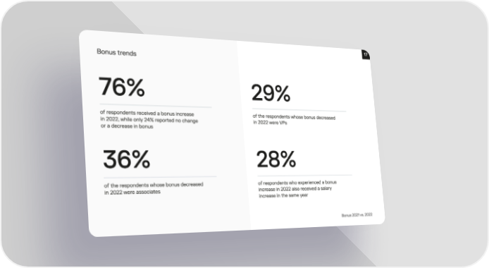 17 Bonus trend猀 76% 29% of respondents received a bonus increas攠⠀ of the respondents whose bonus decrease搀 in 2022, while only 24% reported no chang攠⠀ in 2022 were VPs or a decrease in bonus 36% 28% of the respondents whose bonus decrease搀 of respondents who experienced a bonu猀 in 2022 were associates increase in 2022 also received a salar礀 increase in the same year Bonus 2021 vs. 2022