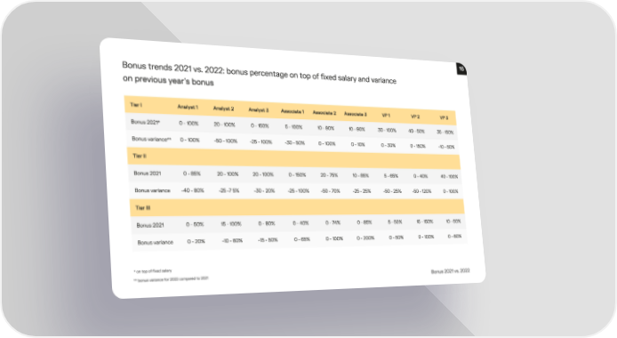 16 Bonus trends 2021 vs. 2022: bonus percentage on top of 昀椀xed salary and variance on previous year's bonus Tier I Analyst 1 Analyst 2 Analyst 3 Associate 1 Associate 2 Associate 3 VP 1 VP 2 VP 3 0 - 100% 20 - 100% 0 - 150% 5 - 100% 10 - 90% 10 - 90% 30 - 100% 40 - 50% 35 - 150% Bonus 2021* 0 - 100% -50 - 100% -25 - 100% -30 - 50% 0 - 100% 0 - 10% 0 - 30% 0 - 150% -10 - 50% Bonus variance** Tier II 0 - 85% 20 - 100% 20 - 100% 0 - 150% 20 - 75% 10 - 85% 5 - 65% 0 - 40% 40 - 100% Bonus 2021 -40 - 80% -25 -7 5% -30 - 20% -25 - 100% -50 - 70% -25 - 25% -50 - 25% -50 - 120% 0 - 100% Bonus variance Tier III 0 - 50% 15 - 100% 0 - 80% 0 - 40% 0 - 74% 0 - 85% 5 - 50% 15 - 150% 10 - 50% Bonus 2021 0 - 20% -10 - 60% -15 - 50% 0 - 65% 0 - 100% 0 - 200% 0 - 50% 0 - 100% 0 - 60% Bonus variance * on top of 昀椀xed salary ** bonus variance for 2022 compared to 2021 Bonus 2021 vs. 2022