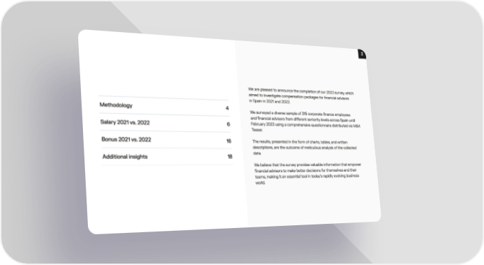 3 We are pleased to announce the completion of our 2023 survey, which aimed to investigate compensation packages for 昀椀nancial advisor猠⠀ in Spain in 2021 and 2022㠀 Methodology 4 We surveyed a diverse sample of 315 corporate 昀椀nance employee猠⠀ and 昀椀nancial advisors from di昀昀erent seniority levels across Spain until February 2023 using a comprehensive questionnaire distributed via M&A Salary 2021 vs. 2022 6 Teaser㠀 Bonus 2021 vs. 202㈀ The results, presented in the form of charts, tables, and wri琀琀en 16 descriptions, are the outcome of meticulous analysis of the collected data㠀 Additional insights 18 We believe that the survey provides valuable information that empower 昀椀nancial advisors to make be琀琀er decisions for themselves and their teams, making it an essential tool in today's rapidly evolving business world.