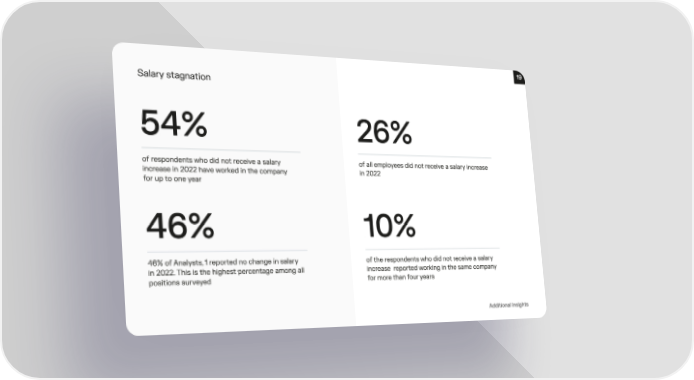 19 Salary stagnatio砀 54% 26% of respondents who did not receive a salary of all employees did not receive a salary increase increase in 2022 have worked in the compan礀 in 2022 for up to one year 46% 10% 46% of Analysts, 1 reported no change in salar礀 of the respondents who did not receive a salary in 2022. This is the highest percentage among all increase reported working in the same company positions surveyed for more than four years Additional insights
