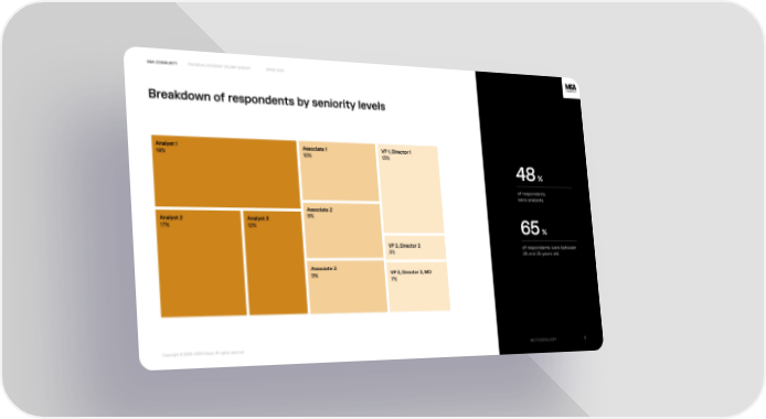 M&A Community Financial Advisory Salary Survey spain 2024 Breakdown of respondents by seniority levels Analyst 1 Associate 1 VP 1, Director 1 19% 10% 13% 48% of respondent猠⠀ were analysts. Associate 2 9% Analyst 2 Analyst 3 17% 12% 65% VP 2, Director 2 of respondents were between 3% 26 and 35 years old. Associate 3 VP 3, Director 3, MD 9% 7% Methodology 5 Copyright © 2008—2024 iDeals. All rights reserved