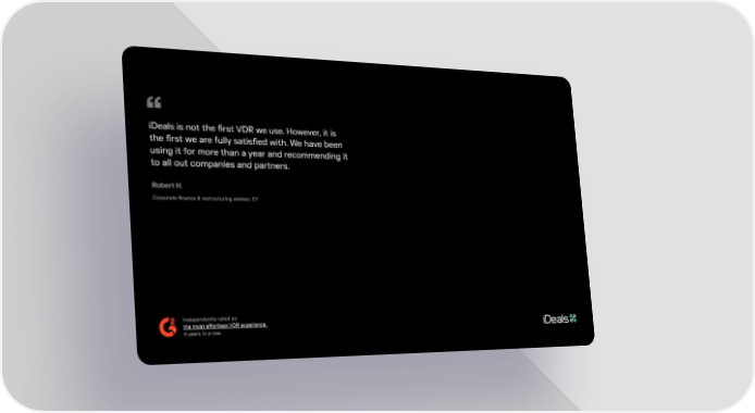 iDeals is not the 昀椀rst VDR we use. However, it i猀 the 昀椀rst we are fully satis昀椀ed with. We have bee渀 using it for more than a year and recommending i琀 to all out companies and partners. Robert H. Corporate 昀椀nance & restructuring advisor, EY Independently rated a猠⠀ the most e昀昀ortless VDR experience.†⠀ iDealsvdr.com 4 years in a row.