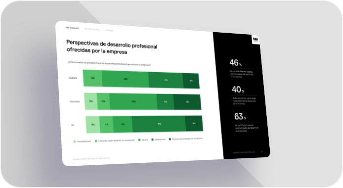 M&A Community Encuesta Salarial latam 2024 Perspectivas de desarrollo profesiona氠⠀ ofrecidas por la empresa 46% ¿Cómo evalúa las perspectivas de desarrollo profesional que ofrece su empresa? de los analistas ven buenas oportunidades de desarrollo en la empresa. 15% 39% 31% 15% Analista 40% de los asociados ven buenas oportunidades de desarrollo 10% 10% 40% 15% 25% Asociado en la empresa. 63% 11% 11% 15% 47% 16% VP de los VPs ven buenas oportunidades de desarrollo en la empresa. Insatisfactorio Limitadas oportunidades de crecimiento Neutral Satisfactorio Muchas oportunidades de crecimiento Perspectivas adicionales 21 Copyright © 2008—2024 iDeals. All rights reserved