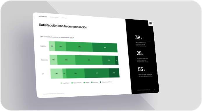 M&A Community Encuesta Salarial latam 2024 Satisfacción con la compensación 38% ¿Qué tan satisfecho está con su compensación actual? de los analistas están satisfechos con su compensación actual. 8% 15% 39% 38% Analista 25% de los asociados están satisfechos con su 10% 25% 40% 20% 5% Associado compensación actual. 53% 16% 5% 26% 37% 16% VP de los VPs están satisfechos con su compensación actual. Insatisfecho Algo satisfecho Neutral Satifecho Altamente satisfecho Perspectivas adicionales 19 Copyright © 2008—2024 iDeals. All rights reserved