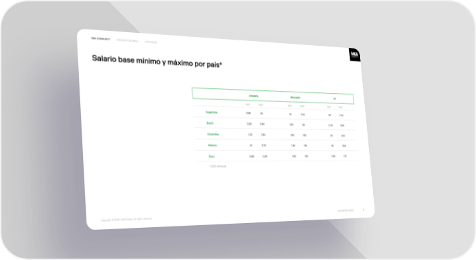 M&A Community Encuesta Salarial latam 2024 Salario base mínimo y máximo por país* Analista Asociado VP Min MAX Min MAX Min MAX Argentina 0,8K 3K 1K 4.1K 2K 7.4K Brazil 0,8K 5.6K 1.6K 9K 2.4K 34K Colombia 1.2K 7.8K 1.6K 12K 2K 25K Mexico 1K 3.7K 1.8K 13K 3K 25K Peru 0,8K 2.8K 1.6K 12K 1.8K 17K *USD mensual Copyright © 2008—2024 iDeals. All rights reserved Salarios 2023 9