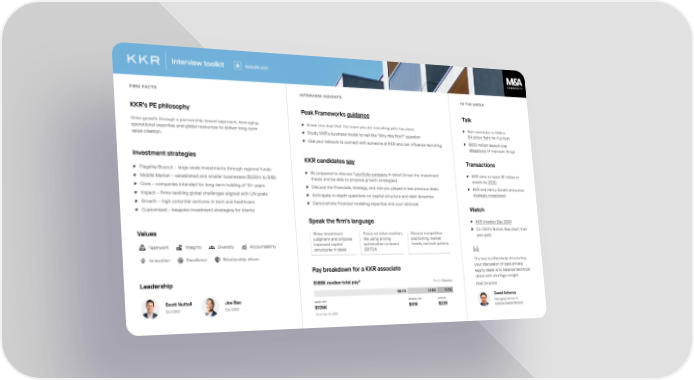 Firm Facts KKR’s PE philosophy Drive growth through a partnership-based approach, leveraging operational expertise and global resources to deliver long-term value creation. Investment strategies Flagship Buyout – large-scale investments through regional funds Middle Market – established and smaller businesses ($220m to $1B) Core – companies intended for long-term holding of 10+ years Impact – firms tackling global challenges aligned with UN goals Growth – high-potential ventures in tech and healthcare Customized – bespoke investment strategies for clients Values Teamwork Integrity Diversity Accountability Innovation Excellence Relationship-driven Leadership Scott Nuttall Co-CEO Joe Bae Co-CEO Interview Insights Peak Frameworks guidance Know one deal that the team you are recruiting with has done Study KKR’s business model to nail the “Why this firm?” question Use your network to connect with someone at KKR who can influence recruiting KKR candidates say Be prepared to discuss 1 portfolio company in detail (know the investment thesis and be able to propose growth strategies) Discuss the financials, strategy, and role you played in two previous deals Anticipate in-depth questions on capital structure and debt dynamics Demonstrate financial modeling expertise and your rationale Speak the firm’s language Show investment judgment and propose improved capital structures in deals Focus on value creation, like using pricing optimization to boost EBITDA Discuss competitive positioning, market trends, and exit options In the Media Interview toolkit www.kkr.com Talk Bain concedes to KKR in $4 billion fight for Fuji Soft $650 million lawsuit over allegations of improper filings Transactions KKR aims to reach $1 trillion in assets by 2030 KKR and Henry Schein announce strategic investment Watch KKR Investor Day 2024 Co-CEO’s Nuttall, Bae chart their own path The key to effectively structuring your discussion of past private equity deals is to balance technical detail with strategic insight. Read the article David Acharya Managing Partner of Acharya Capital Partners 66.4% 21.8% Base pay STOCK Bonus pay $188K median total pay* $125K $22K $41K Source: Glassdoor *As of Apr 10, 2025 Pay breakdown for a KKR associate 11.7%
